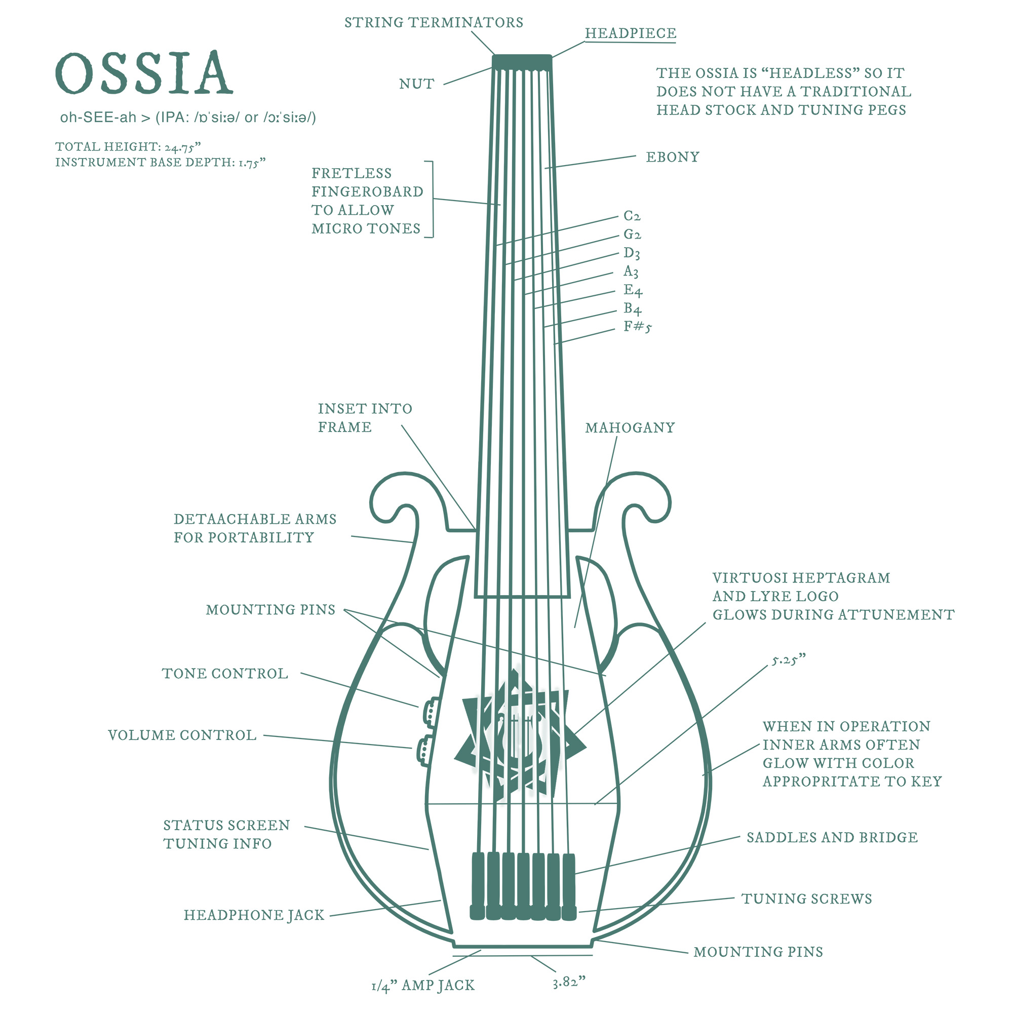 This is not a flaw. In an ordinary room, an unplugged ossia produces a quiet, intimate sound—present but contained, unlikely to disturb your neighbors, unlikely to announce you to a room before you've decided to be announced. String tension translates directly into the output signal via a piezo-sensor array housed beneath the sigil plate on the body's face. The 1/4" jack at the base routes to an amplifier. The headphone jack allows for private operation. This arrangement also allows for further refinements during attunement, giving me an advantage over other less flexible instruments.
